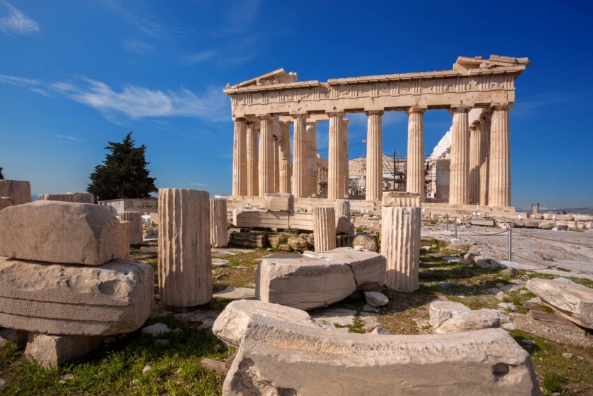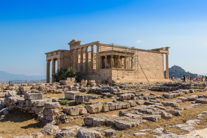 Il Partenone, simbolo eterno di Atene, custodiva un tempo una colossale statua della dea Atena in oro e avorio, opera di Fidia. I Propilei, il grande portale d’ingresso in marmo bianco e pietra grigia, esibisce colonne nei tre stili classici, dorico, ionico e corinzio, come in un manuale di architettura a cielo aperto. L’Eretteo, dalla pianta asimmetrica, regala il dettaglio più fotografato: il portico delle Cariatidi, sei sculture femminili alte sei metri che reggono il tetto con grazia senza tempo. E infine il Tempio di Atena Nike, il più piccolo del complesso, con il suo fregio di battaglie greco-persiane ora conservato (in parte) nel vicino museo.